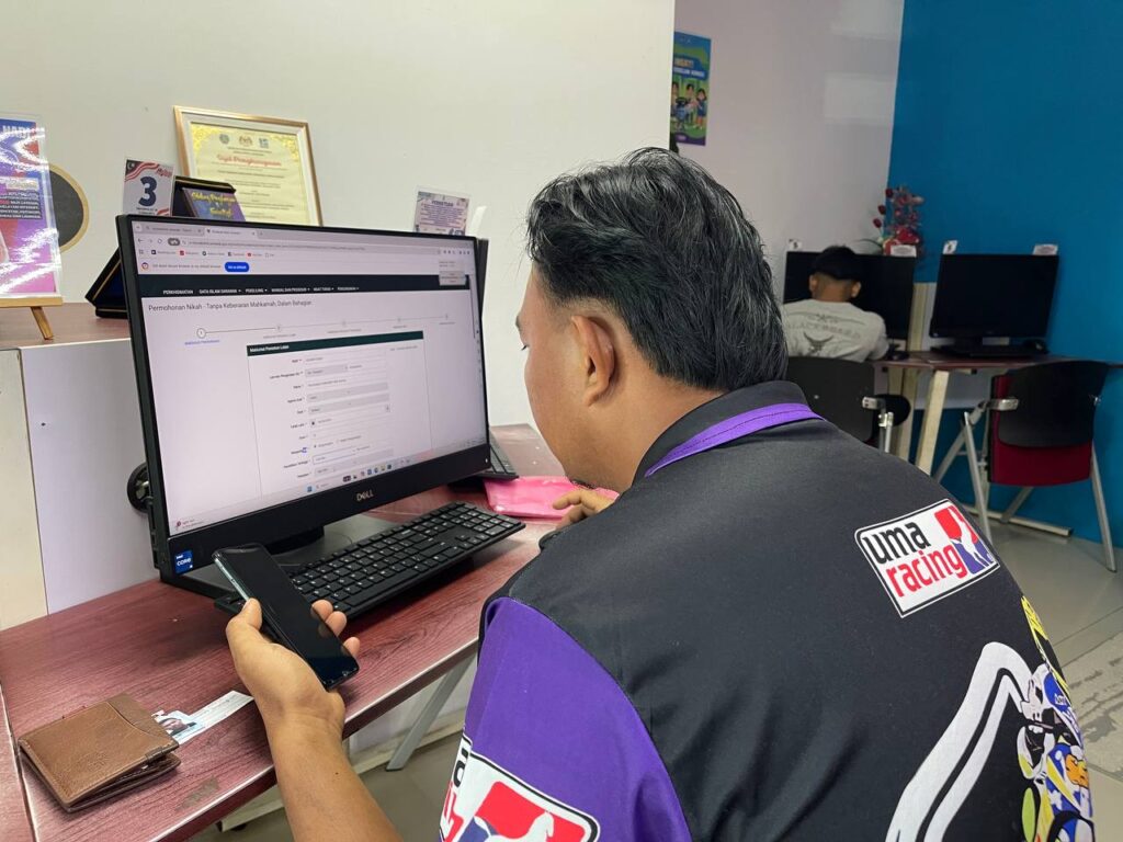 AKTIVITI : Aktiviti yang dijalankan ialah sesi bimbingan dan bantuan secara langsung oleh petugas NADI kepada pemohon dalam proses permohonan nikah melalui laman KISWA, termasuk semakan maklumat peribadi, panduan pengisian borang dalam talian, serta penerangan berkaitan senarai dan penyediaan dokumen sokongan yang diperlukan sebelum permohonan dihantar.
